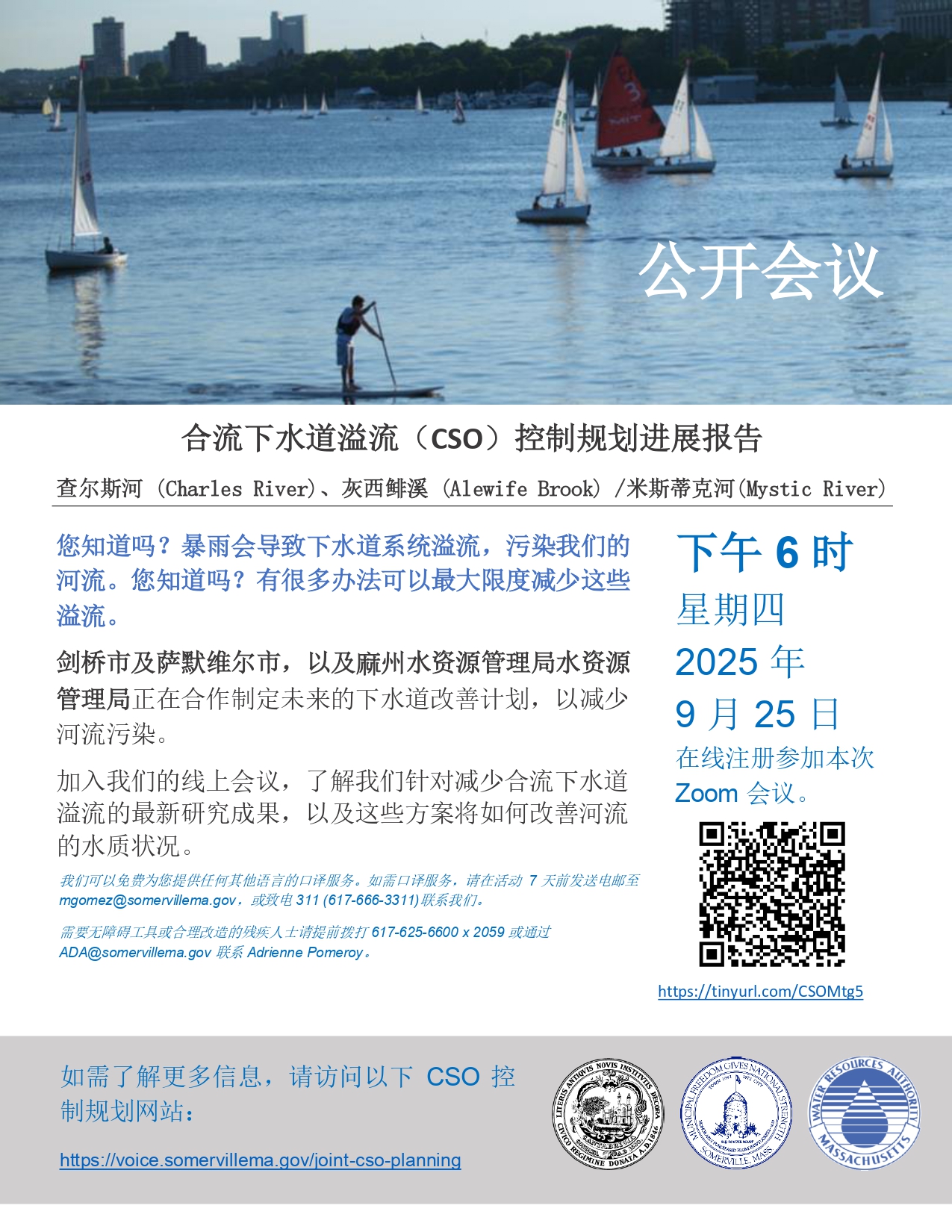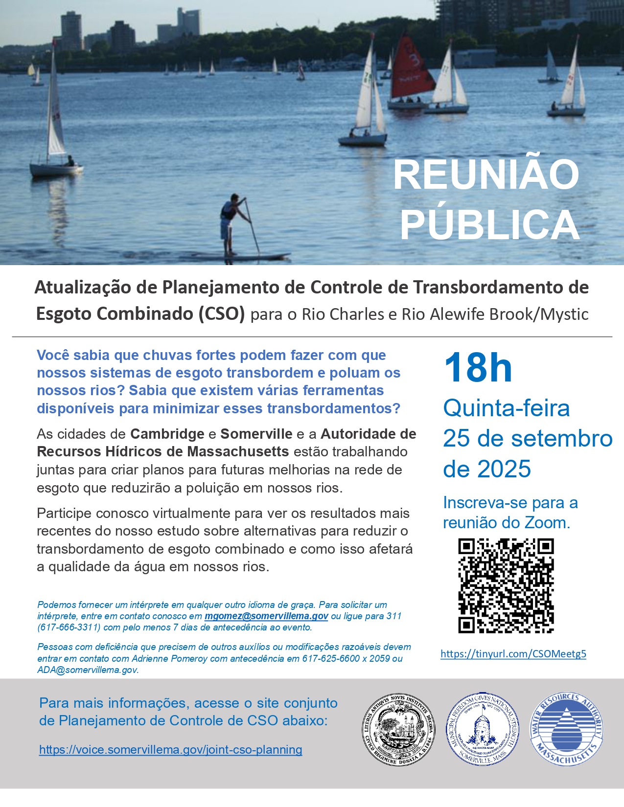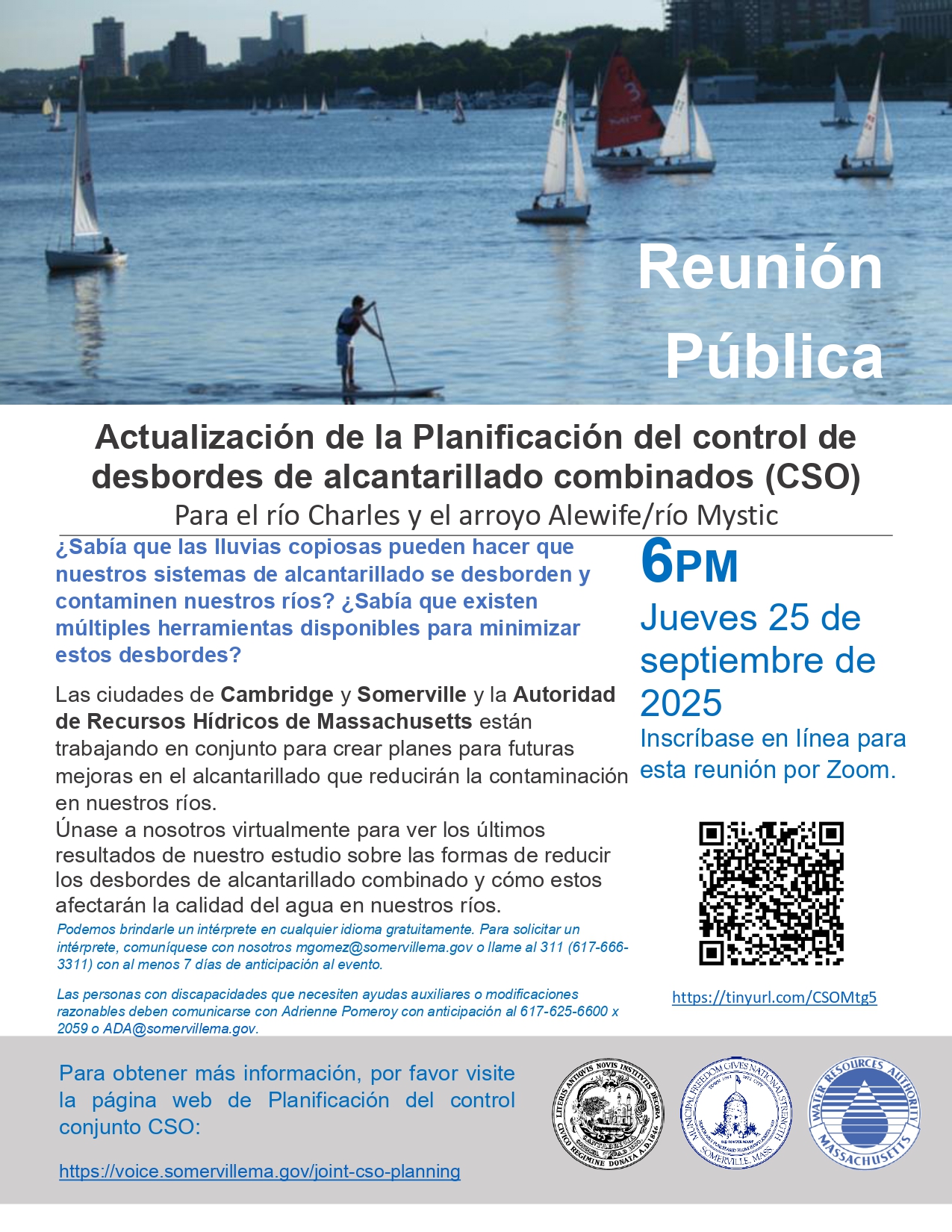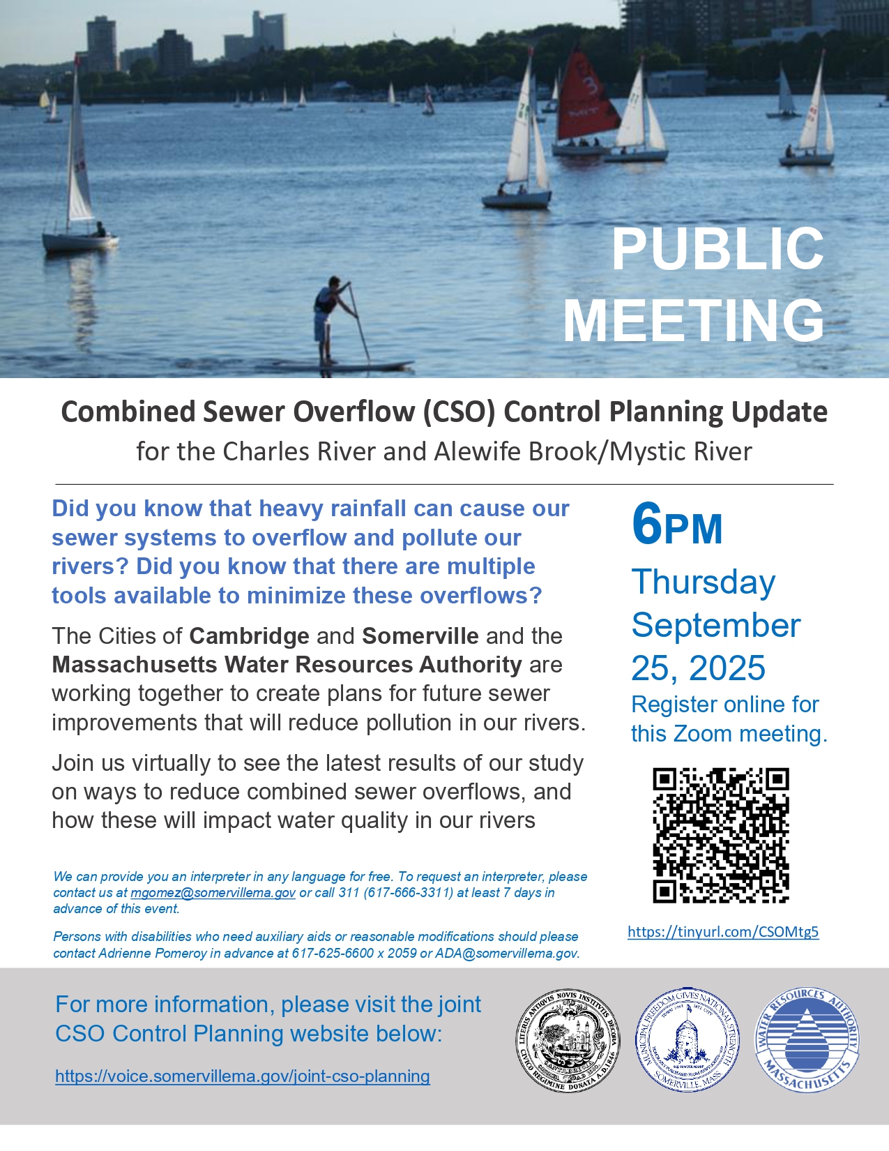 You are invited to a virtual public meeting to discuss improving water quality in our rivers through the development of an updated CSO Control Plan. This meeting is a collaboration between the City of Somerville, the City of Cambridge, and the Massachusetts Water Resources Authority (MWRA). Join us for this joint public meeting to learn about the alternatives developed so far to control combined sewer overflows and how the affordability will be evaluated for each entity.The meeting will take place virtually on Zoom.