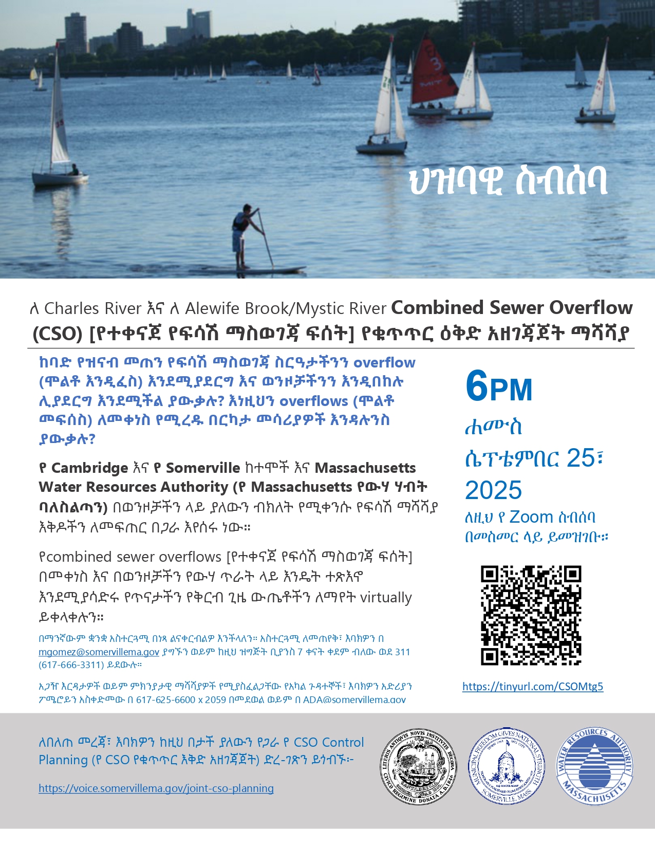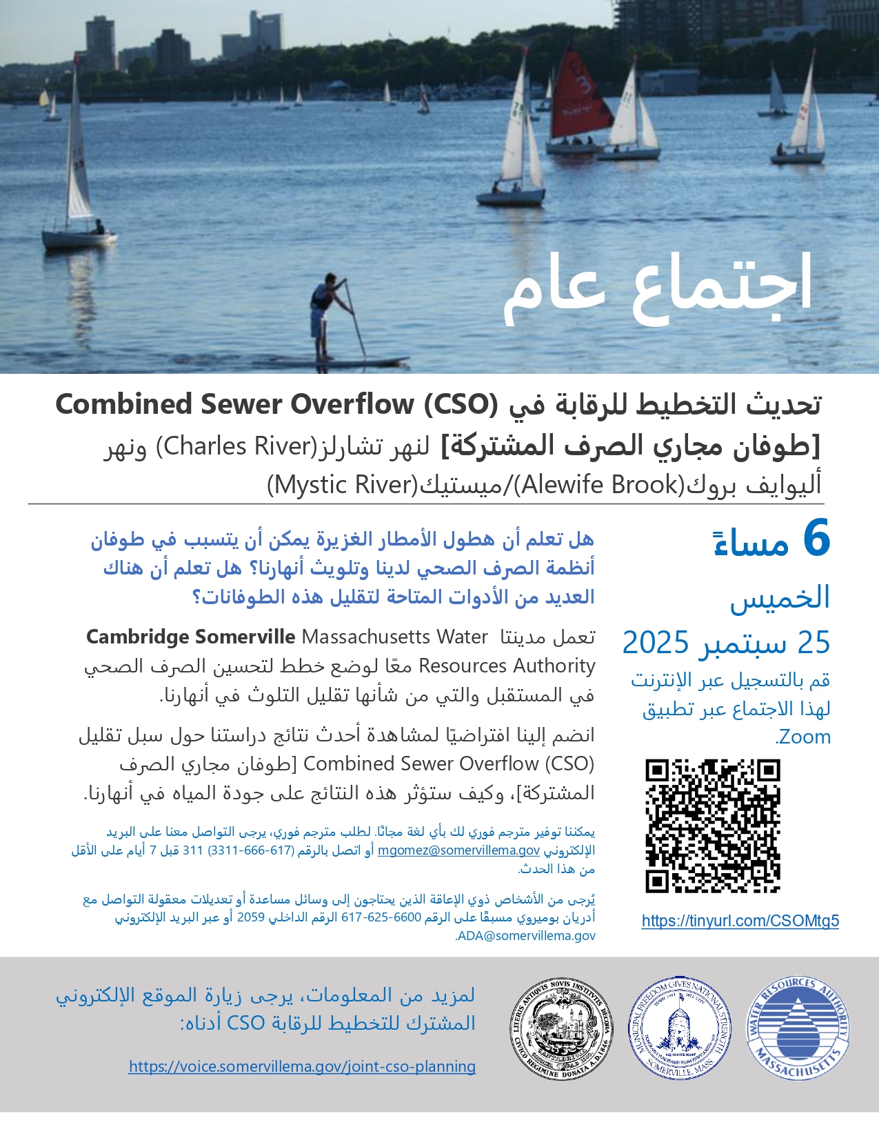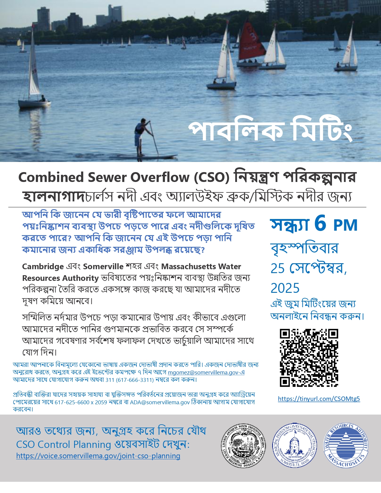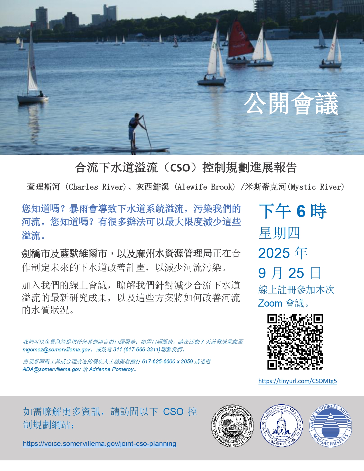 You are invited to a virtual public meeting to discuss improving water quality in our rivers through the development of an updated CSO Control Plan. This meeting is a collaboration between the City of Somerville, the City of Cambridge, and the Massachusetts Water Resources Authority (MWRA). Join us for this joint public meeting to learn about the alternatives developed so far to control combined sewer overflows and how the affordability will be evaluated for each entity.The meeting will take place virtually on Zoom.