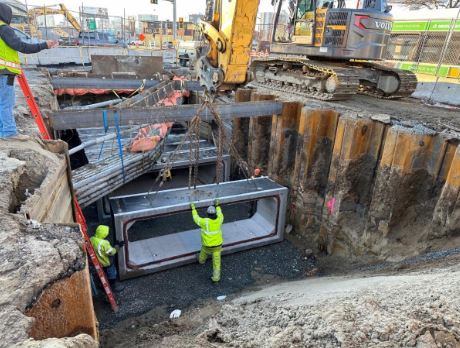 Crews install a stormwater box culvert as part of earlier work on utilities under Somerville Avenue in Union Square