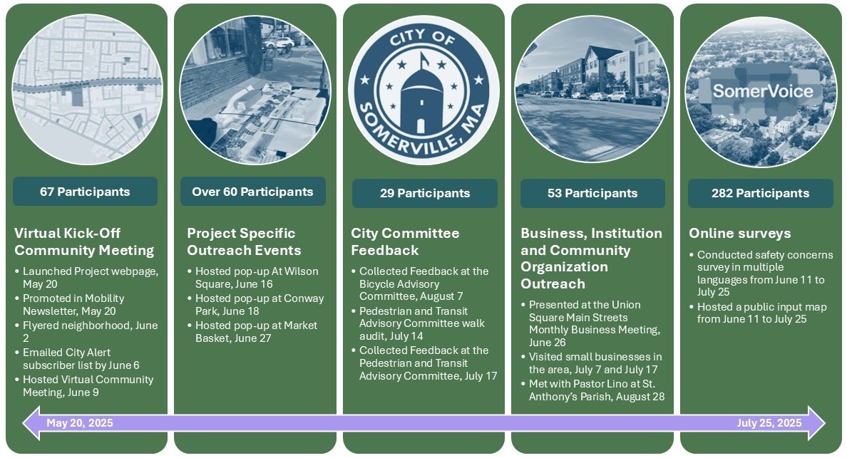 From May 20 to July 25, 2025, we worked to engage community members in the first phase for the Somerville Avenue Quick-Build Safety Improvements project. During this phase, we aimed to promote awareness about the quick-build project, hear insight into how the street is used, learn about community members’ safety concerns and gather feedback on ways to make it safer and more comfortable for all users.